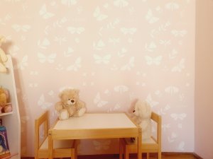 Ich habe die Feldschmetterlingsschablone im Zimmer meiner Kleinen verwendet. Sie ist sehr einfach zu benutzen und in 2 bis 3 Stunden ist eine ganze Wand fertig. Und der Effekt ist wow. Ich lasse euch ein paar Fotos hier, damit ihr seht, wie es geworden ist. Ich bin sehr zufrieden mit dem Ergebnis!!